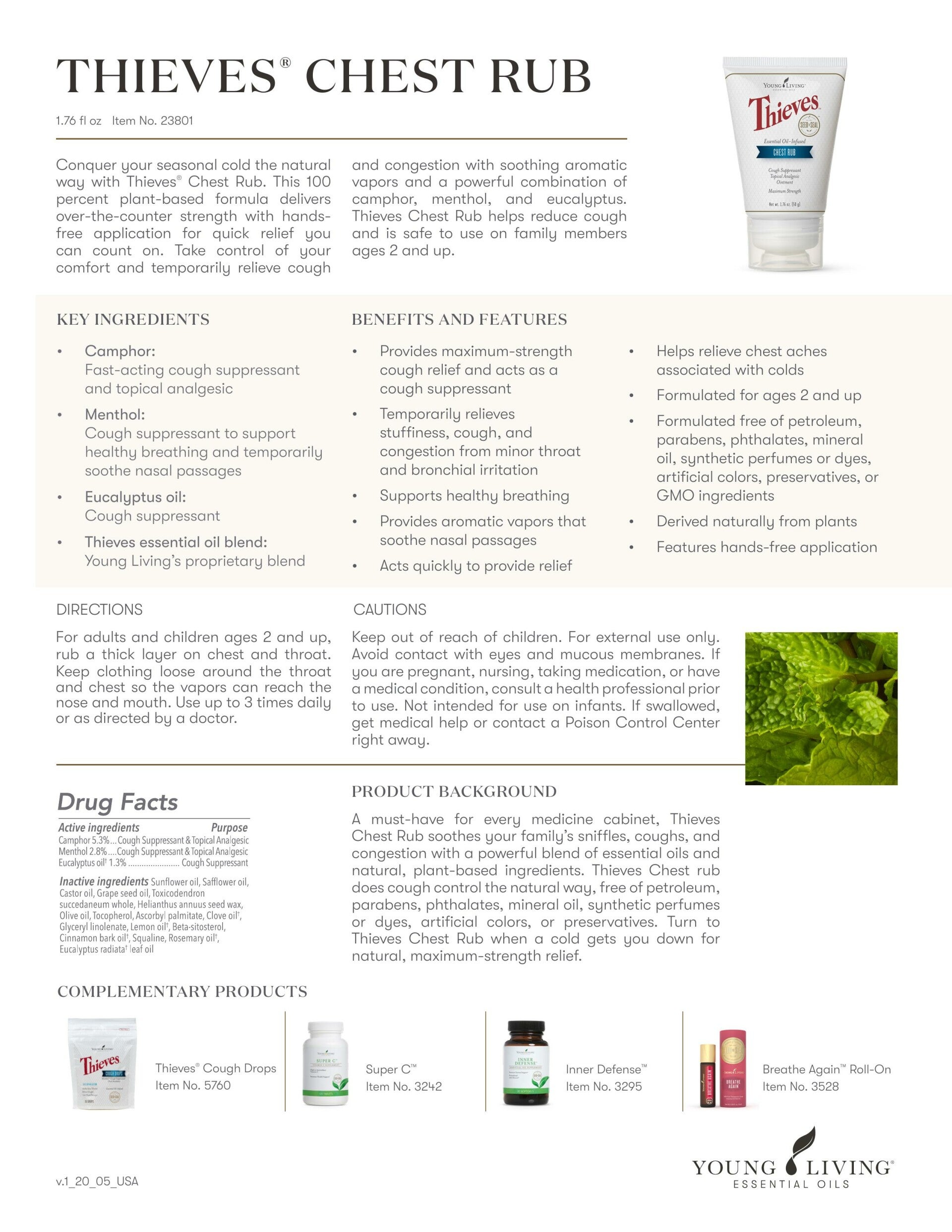Overwin uw seizoenskou op een natuurlijke manier met Thieves® Chest Rub met deze 100 procent plantaardige formule. Neem de controle over uw comfort en verlicht tijdelijk hoest en congestie met kalmerende aromatische dampen en een krachtige combinatie van kamfer, menthol en eucalyptus. Thieves Chest Rub helpt hoest te verminderen en is veilig te gebruiken voor gezinsleden van 2 jaar en ouder.
